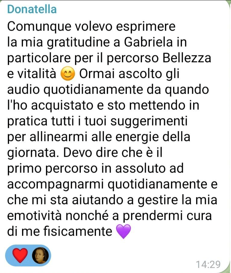 Nel per-corso BELLEZZA E VITALITA’ hai accesso a molte pratiche femminili tra le quali anche la Pratica della Cerbiatta, una tecnica taoista poco conosciuta in Occidente sebbene sia stata praticata per migliaia di anni in Oriente, la durata è di circa 15 minuti ogni giorno. Me ne sono innamorata e voglio farla conoscere alle donne per i suoi incredibili benefici sul corpo femminile, che ovviamente si ottengono solo quando viene praticata regolarmente. Mi piace lo stato che mi dà, il modo in cui mi aiuta a conoscere il mio corpo e gli effetti sull’armonizzazione corporea accumulati nel tempo.