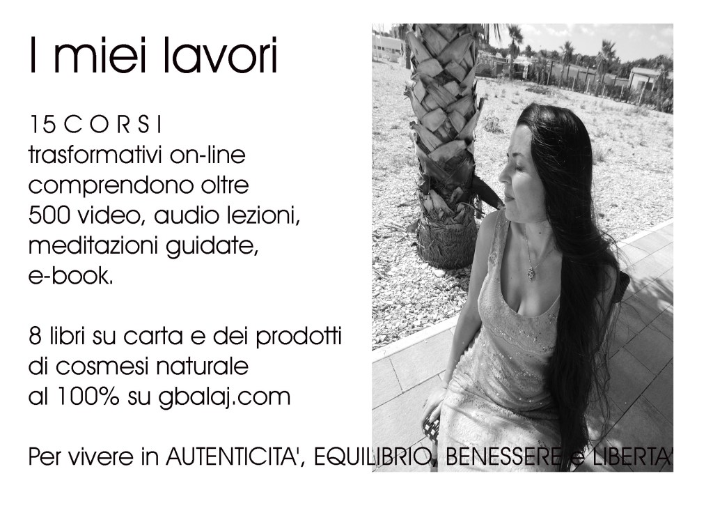 In questa pagina vedi parti del mio ikigai, ovvero la mia ragione di vivere, le tante CREAZIONI firmate con gioia Gabriela I Balaj. Trovi informazioni dettagliate sui colloqui 1 a 1 con me TU VALORE, sui perCorsi AccadeMia Femminilità, sulle consulenze professionali di feng shui.